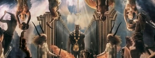 By no means am I an expert on all of this. The more I read into ancient symbols and what they symbolize, the more I get my own idea of what they could possibly mean to the artists creating this portrait. Artists, as is more than one. This is a collaboration of Kanye West and Marco Brambilla. I’m still researching Brambilla, but from the interviews, it sounds like he may have been the driving force behind how and what visuals are played out, interpreting West’s lyrics to an exaggerated sense of the concept of power.